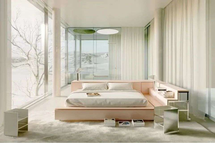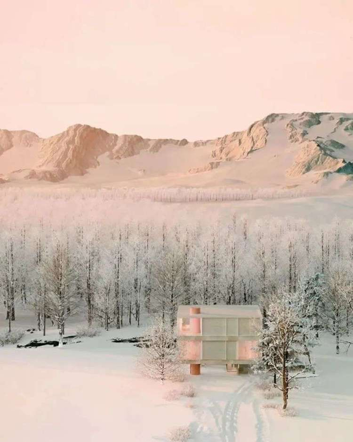 2022年,来自阿根廷的90后设计师Andrés Reisinger设计了一座屹立于皑皑白雪中的虚拟住宅——Winter House。整个建筑以干净的几何线条和淡然的色彩构成,极具现代主义风格,在周边冰雪的衬托之下,呈现出宁静的美。建筑采用混凝土结构,立面采用大面积的玻璃,内部家具大部分由Reisinger设计,以柔和的粉色为主。这些家具减轻了混凝土、玻璃与钢材构成的冰冷感,为整个住宅增添了温暖的气息。