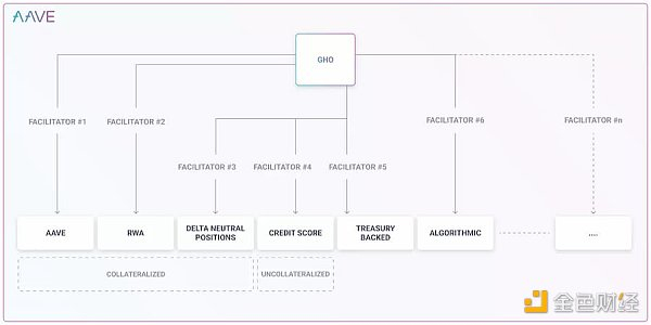 GHO 引入了促进者(Facilitator)概念,一个促进者(例如协议、实体)具有无需信任地生成(和销毁)GHO 代币的能力。当然,任何促进者都必须得到 Aave 治理的批准。不同的促进者将能够对他们的 GHO 应用不同的策略,同时,促进者可以生成的 GHO 也会有上限,具体由治理决定。设置上限主要是为了保持抵押和降低风险。
