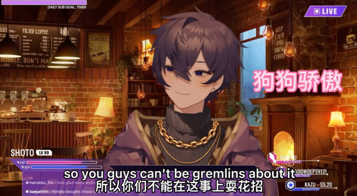 入驻后第一段48秒的“小狗叫”视频,便斩获了277万播放量,当日B站全站排行榜第一。这便是紫发紫瞳的二次元少年Shoto的魅力,Shoto的设定为“勇猛的职业恶魔猎人”,不过粉丝们更多称呼他为“修狗”(小狗)。据传其中之人为美籍越南裔学霸,对技术要求高,因此形象灵敏度非常高。