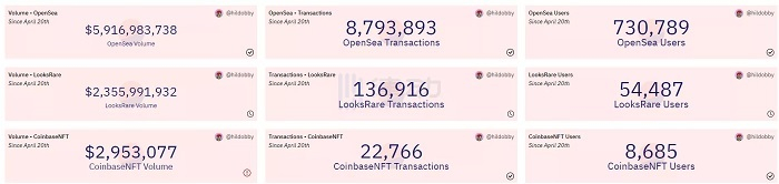 OpenSea、LooksRare 仍是 NFT 市场“霸主”,而 Coinbase NFT 推出三个月后总交易额竟不足 300 万美元。据 Dune Analytics 数据显示,自 4 月 20 日推出以来,Coinbase NFT 交易量仅 290 万美元,截至目前为 2,953,077 美元,交易量为 22,766 笔。NFT 市场 OpenSea 同期交易额已超过 59 亿美元,截至目前为 5,916,983,738 美元,交易量为 8,793,893 笔;LooksRare 的交易额为 2,355,991,932 美元,交易量为 136,916 笔。