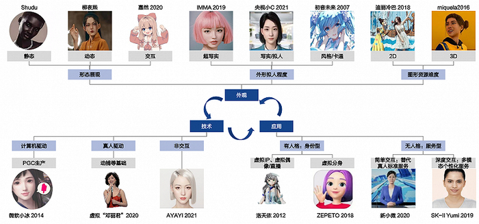 从应用层来看,当前主流的虚拟人可以分为两种类型:服务型虚拟人和身份型虚拟人。前者主要用于代替真人服务,是现实世界中服务型角色的虚拟代表;后者多为虚拟IP/偶像,意在推动虚拟内容的生产,也可以是虚拟世界里用户的第二分身。