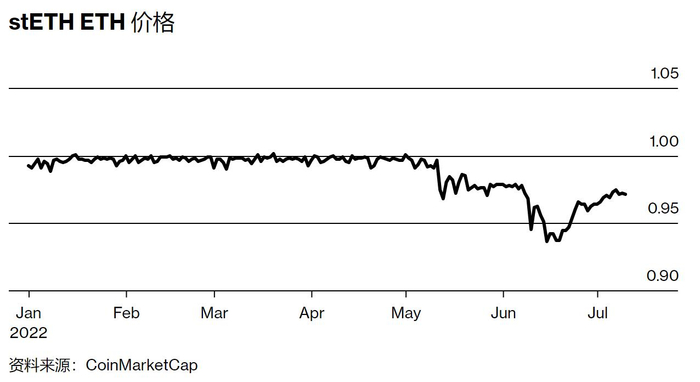 之后,崩盘通过加密货币继续传播。三箭资本还在一个名为 Lido Finance 的平台上投资了 ETH,试图从所谓的质押中获得收益。简而言之,在验证区块链交易的技术过程中需要 ETH。如果你同意长期锁定代币以支持此活动,你将来可以获得更多的 ETH 作为奖励。Lido 的创新之处在于,当其储户的以 ETH 锁定时,他们会获得另一种可交易的代币 stETH。今年大部分时间,stETH 的交易价格与 ETH 持平,但在 Luna 崩盘后,由于交易员争相退出,价格跌至 7% 的低位。
