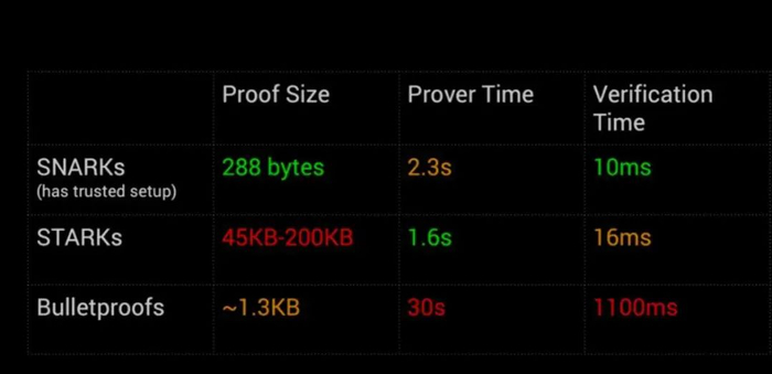 STARK 相较于其他两种零知识证明算法,证明大小大非常多,但在计算时的大小和证明速度上有很大优势,同时 STARK 的安全性更高,可以抗量子攻击。