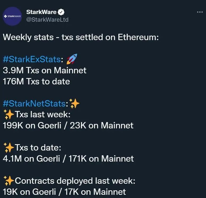截止 6 月 6 日,通过 StarkEx 的总交易笔数逾 1.76 亿笔,累计交易价值超 4500 亿美元,StarkNet 迄今为止在 Goerli (一个由多个客户端支持的权威证明区块链)上共产生 410 万笔,主网上有 17.1 万笔交易。
