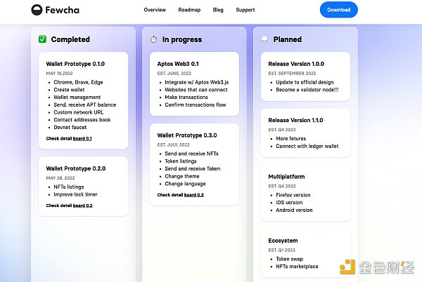 Fewcha Wallet 是 Aptos 区块链上的非托管 Web3.0 钱包,其功能包括支持代币上线和交易以及 NFT 的铸造和转移。Fewcha Wallet 于今年 5 月发布了测试版插件钱包,该插件钱包在 Chrome 商店中可下载,将于 2022 年第三季度在移动设备上可用。根据 Fewcha 的推特,Fewcha Wallet 的下载量截止 7 月 8 日达到 3200。下图为 Fewcha Wallet 的发展路线图。
