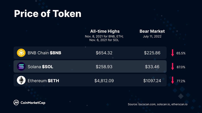 博链财经获悉,CoinMarkETCap统计数据显示,截至7月11日,自2021年11月实现历史最高记录以来,以太坊、BNB Chain和Solana的链上活动都出现显著下降。