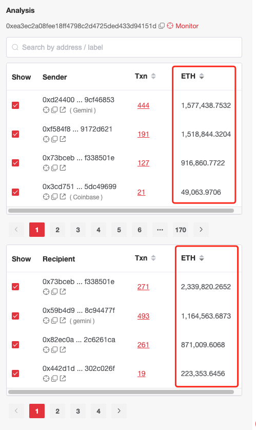 疑似Gemini相关地址在过去数小时内共转出逾20万枚ETH,超3亿美元