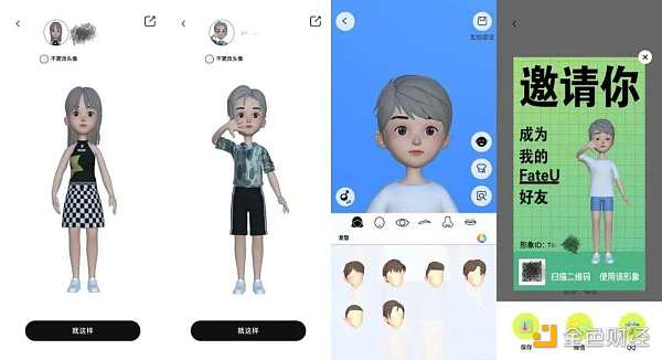 其次,‘FateU’鼓励用户“捏脸送人”。用户完全可以像给自己捏脸一样打造一个全新的 Avatar 形象,并赠送给好友,对方只需要扫 Avatar 图片中的二维码就可以直接完成一键换装。除了是一种有趣的交互模式,也是一种不错的增长营销模式。