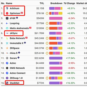 目前,Optimistic Rollup的L2代表网络是Optimism和Arbitrum;ZK Rollup方案的L2落地网络的主要选手是StarkNet和zkSync。