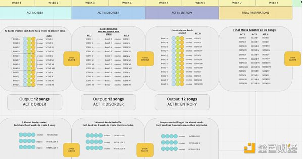 45 名创作者被分成三人一组的 band ,共 15 组,每组都配备有歌手、制作人以及一位其他职能的音乐人,8 周的时间被分为 4 个节点(如下图),进行随机的创作和碰撞,以及有些小组(参加过 Song Camp 之前的活动的 alumni)必须要基于其他组的创作灵感,下图是 Chaos 八周的 pipeline。最后的产出是 45 首歌曲,45 首歌曲因其封面稀有度的不同将被编辑成 20,000 个 NFT 进行售卖。