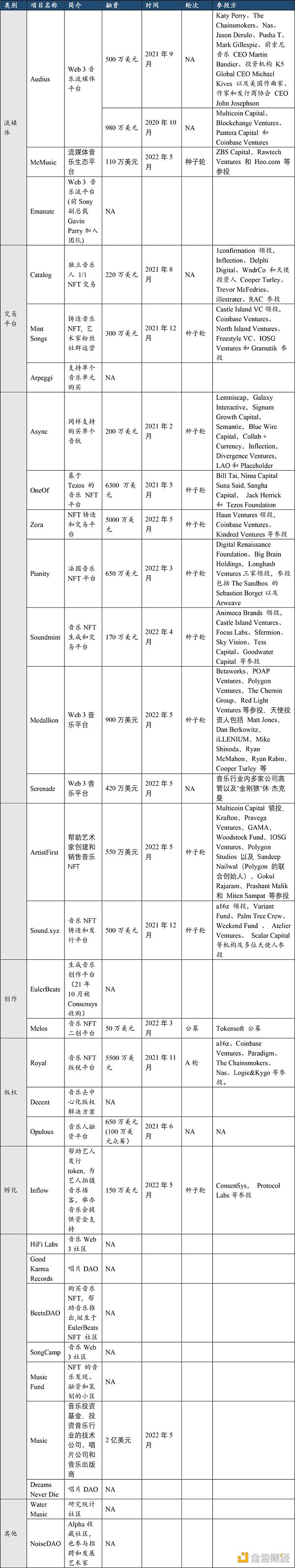 以下我们整理了主要 Web 3 音乐板块的项目融资情况,大多数项目集中在种子轮融资。