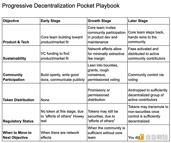 2020 年,A16z 写了一份关于加密货币应用的去中心化的指南,它在 2022 年仍然非常有意义。随着项目建立产品市场契合度、财务可持续性、参与社区和监管合规性,他们应该寻求减少其中心化。