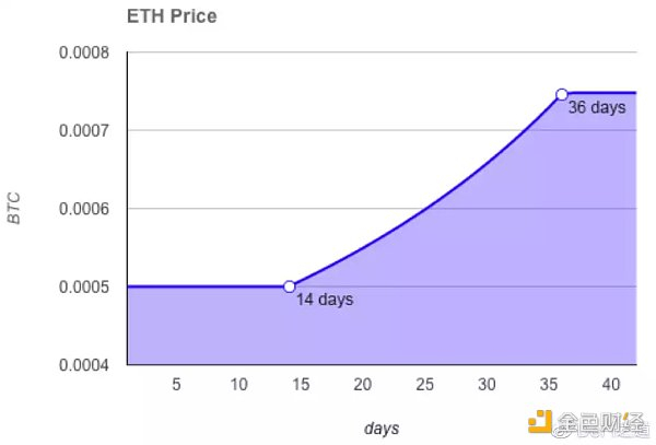 众筹有一套有趣的激励机制,鼓励那些愿意提前参与的人。在销售的前两周,1 BTC 可以购买 2000 ETH,此后价格线性变化,最终每个 BTC 可以购买 1337 个 ETH。下图显示了以 BTC 计价的 ETH 价格,以显示 ETH 在众筹初期的折扣价以及从发售第 14 天到第 36 天的上涨价格。