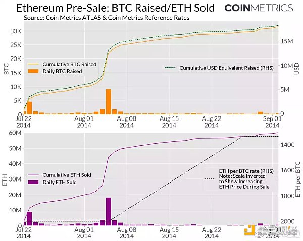 同时也显示了众筹期间筹集的 BTC 和美元等值总额以及售出的 ETH 总额。筹集了超过 31000 BTC,价值约 1830 万美元,共售出 6000 万个 ETH(这使以太坊成为当时第二大众筹活动)。