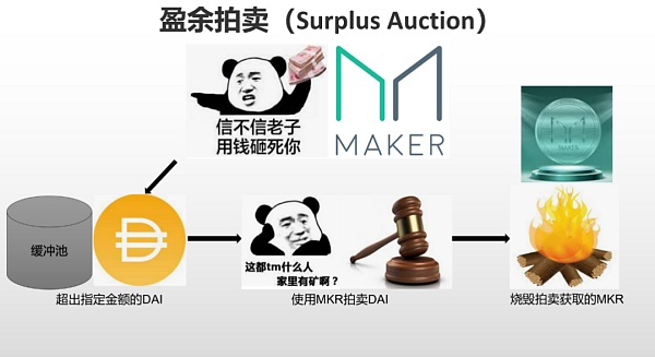 Maker协议其实还有另外一套拍卖机制来确保MKR不会严重超发,那就是盈余拍卖(Surplus Auction)机制。