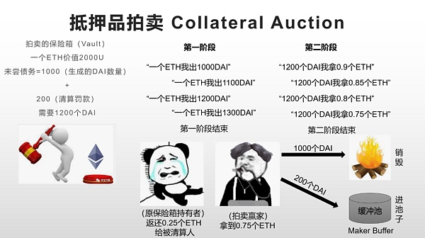 担保品拍卖(Collateral Auction):在第一阶段担保品拍卖中,竞价者开始对拍卖的抵押品出价,最高价者支付 DAI来低价获取抵押品,回购的 DAI 用来弥补金库的未偿债务及清算罚金。