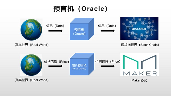 区块链的世界与现实中的世界其实是不互通的,那么这个时候需要有一个桥梁来让两个世界产生联系,Maker协议如何获取现实世界中这些加密资产的价格呢?这需要一个叫做喂价预言机(Price Oracle)的东西来实现。