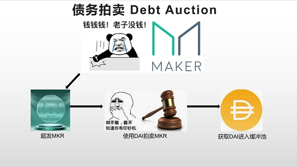债务拍卖(Debt Auction)机制:当缓冲池中的DAI不足以偿还Maker债务时,Maker协议将会超发MKR来启动拍卖程序,拍卖者可以使用DAI拍卖获取MKR,拍卖获取的DAI将进入缓冲池去偿还债务。
