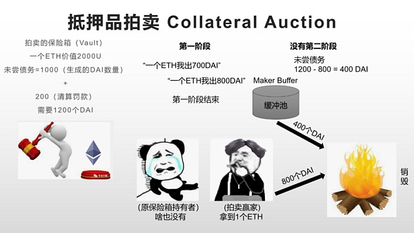 当用户生成的DAI的价值始终少于抵押物允许生成的DAI的价值范围内的时候,一切都会正常运作,但是如果抵押物的价值下降导致用户生成的DAI的价值高于抵押物允许生成的DAI的价值的时候,举个例子,假设ETH铸造DAI的质押率为2:1,用户用价值4000美金的ETH铸造了1000个DAI,此时价值4000美金的ETH最高可以允许铸造2000个DAI,如果当以太坊价值跌破2000美金的时候,此时1000个被铸造的DAI的价值将会高于价值低于2000美金的以太坊允许铸造的最大价值DAI的范围,就会触发清算程序,清算意味着用户不再需要归还DAI,则用户生成的保险箱(Vault)将会被充公进行抵押品拍卖把亏欠系统的DAI补回来,同时被清算的用户还需要缴纳一笔清算罚款,Maker社区的MKR持有者们会针对不同的担保物类型设定不同的清算罚金,被拍卖的抵押物价值会加上清算罚款的金额一并进入拍卖程序。