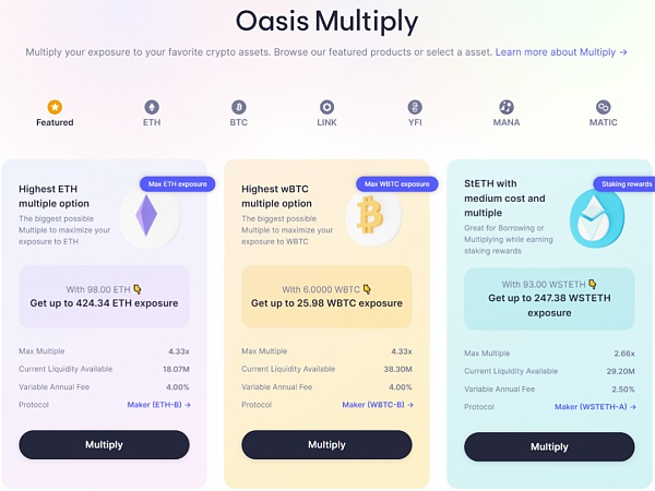 当用户创立一个保险箱(Vault)后,用户可以在Oasis.app上通过Oasis Multiply功能支付由MRK持有人指定的利息来借入DAI在保险箱中(Vault)购买更多的抵押头寸,这使得用户可以在抵押资产价值上升中获取更多的收益,但同时在面临资产下降时也会面临更高的清算风险。