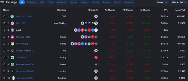 MakerDAO 是一个运行在以太坊区块链上的、集超额抵押稳定币、借贷、存储、用户共同治理和发展的项目,MakerDAO最核心的就是Maker协议,又称多担保 DAI(MCD)系统,可以让用户使用经过协议批准的资产作为担保物来生成去中心化稳定币DAI,截止至2022年7月26日,MakerDAO TVL为$8.03B稳坐DeFi王者宝座。