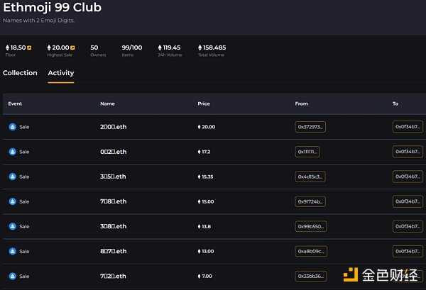此外,Ethmoji 筹码较为集中,有人在 6 小时内以总共 101.35 ETH 的价格购买了 7 个 Ethmoji 99 域名,占供应量的 7% (Ethmoji 99 域名共 100 个),这也将其地板价从 7 ETH 带到 18.5 ETH。