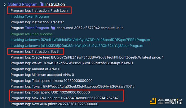第一步,攻击者通过调用 solend 协议的 flash loan 指令,借来了 1025WUSD,随后调用了 Nirvana 程序中的 Buy3 指令,此时根据兑换比例可以算出此时 USD/ANA 为 8.72,兑换后价格为 24.27,此时兑换前价格 / 兑换后价格约为 1/3。