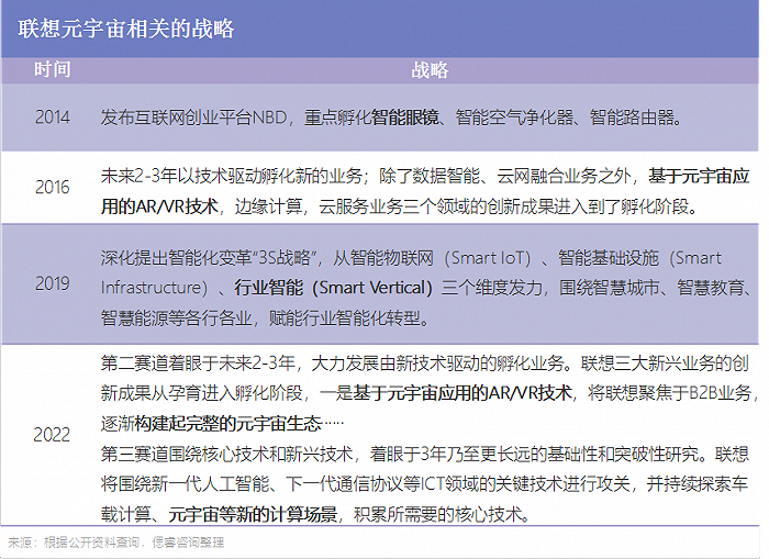 联想对元宇宙“白纸黑字”的战略构想,可以追溯到2016年——预计在2018-2020年,联想孵化基于元宇宙应用的AR/VR技术;在2020年以后,持续探索元宇宙新的计算场景,积累核心技术。