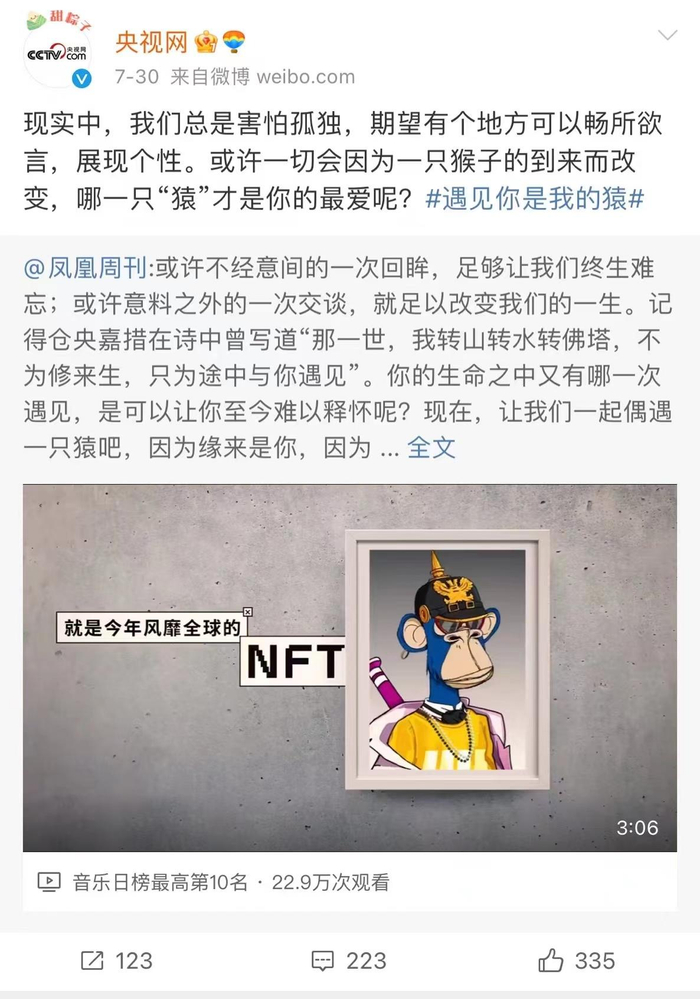 近日,相信不少人看到了以下这张截图,央视网官方微博参与无聊猿“遇见你是我的猿”话题,并转发凤凰周刊官方“无聊猿”宣传视频。