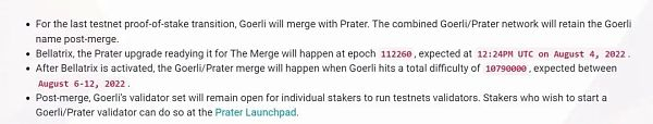 7 月 26 日,以太坊完成了第十次影子分叉,此后以太坊协议支持团队发布 Goerli/Prater 合并公告,明确接下来的合并过程分为两个步骤,预计分别于 UTC 时间 2022 年 8 月 4 日、8 月 6 日至 12 日之间进行。