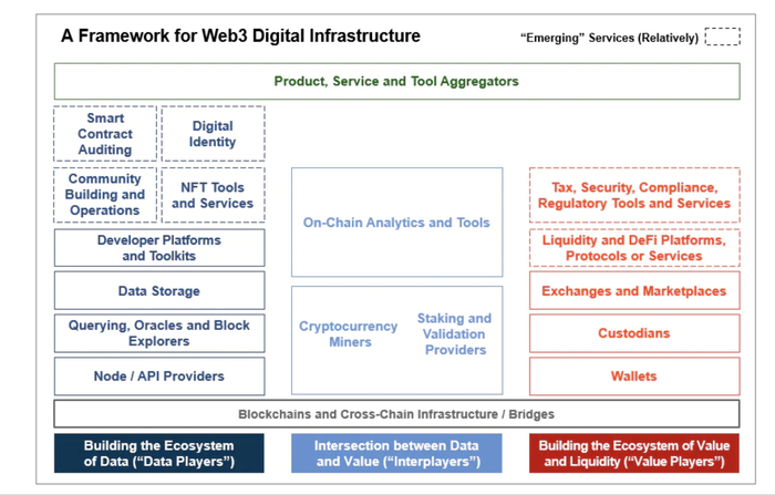 在 Web3 中,人们可以考虑在基础计算(区块链)层之上的三类服务和产品中的数字基础设施——数据、价值/流动性和 Interplayers/区块链支持服务。