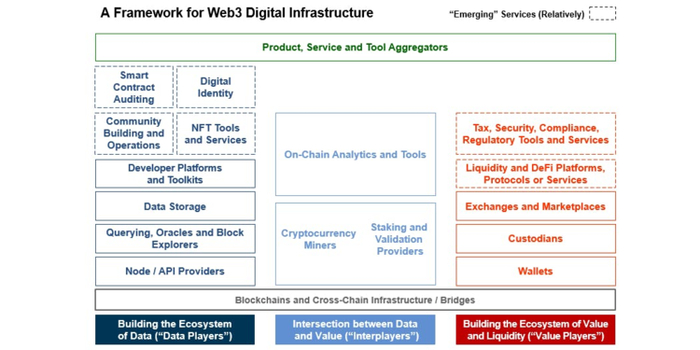 “Interplayers”和支持区块链的基础设施:我们已经强调,Web3 的核心租户是区块链技术允许的价值和数据的结合。 因此,有支持区块链计算层的基础设施,这推动了价值和数据服务获得成功的能力。