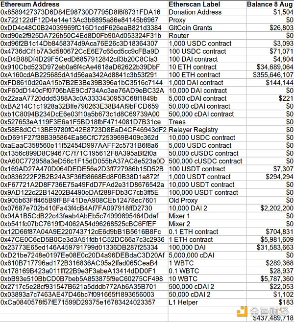 2022年8月8日,Tornado Cash 以及与 Tornado Cash 及其智能合约相关的所有以太坊钱包地址被添加到 OFAC 的 SDN 列表中。所有 Tornado Cash 都被封锁(美国人不能使用),包括他们的@Gitcoin授予钱包。我们从 Etherscan 抓取了钱包信息——这是他们所有的地址,总计 4.37 亿美元的稳定币、ETH 和 WBTC。