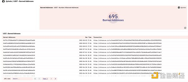 Tether 的 USDT 也可以在以太坊智能合约层面被列入黑名单。可以在Dune上看到被禁止的地址列表。*尚未*添加Tornado。