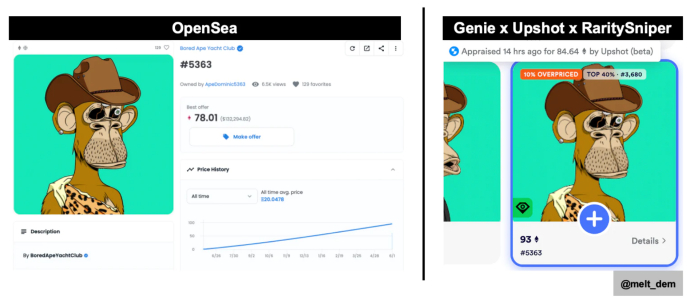 Genie 是一个市场聚合器,从许多不同的市场上拉来定价,包括 OpenSea、LooksRare 等等,不仅整合了来自市场的价格数据,还加入了来自 Upshot * 的评估数据,该数据本身是由广泛的定性和定量数据整合到机器学习算法中的,可以通过 API 消费。此外,还有来自 RaritySniper 的稀有性数据,供那些仍然重视稀有性数据的人使用。请注意,我个人赞同我最喜欢的两位 NFT 思想家提出的公理 -- 如果它不是圣杯,那就是地板。