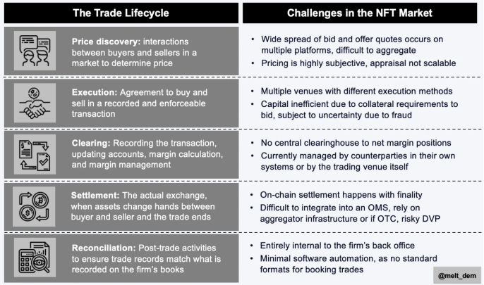 为了分解市场微观结构,在高层次上了解交易的生命周期是有帮助的。以下是对交易生命周期和当前 NFT 市场的一些挑战的简单阐述: