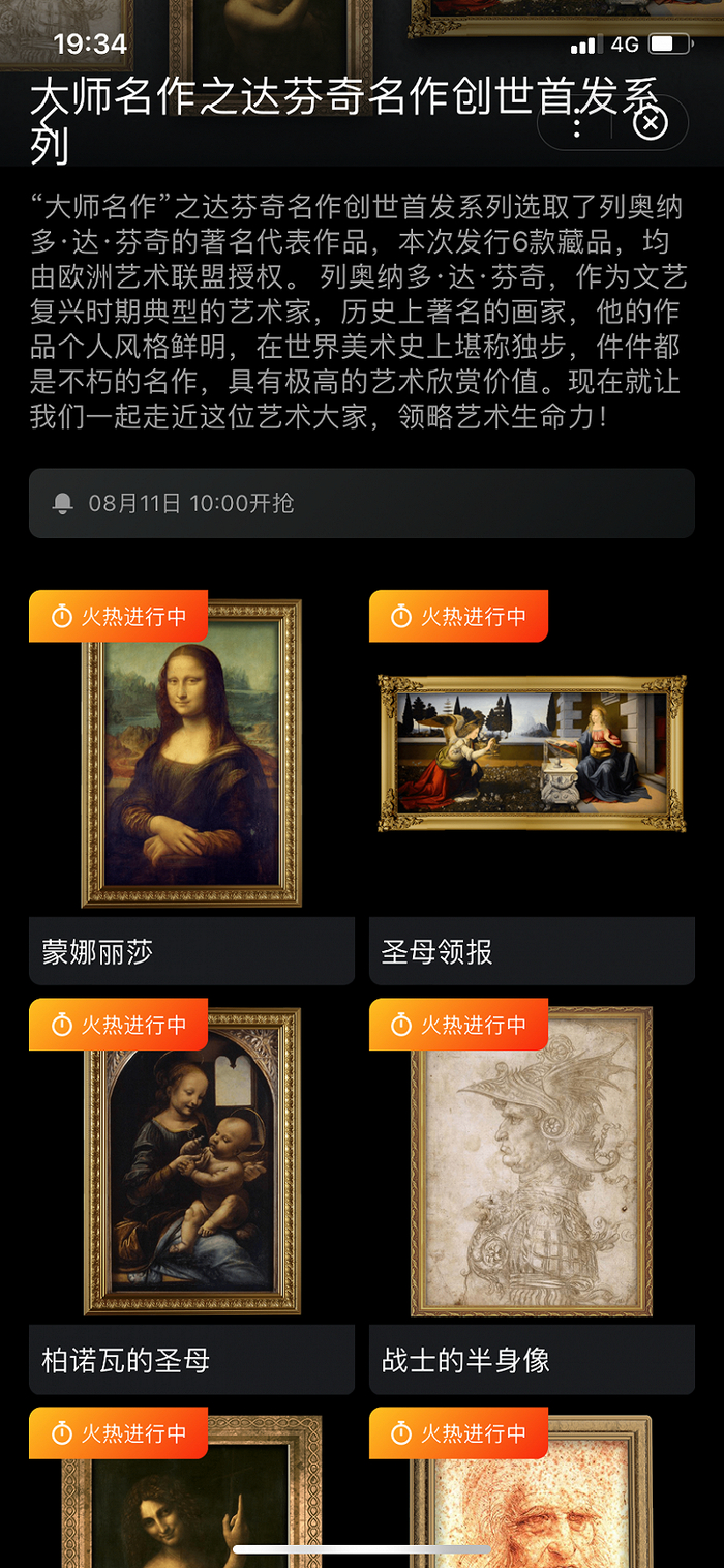 8月11日,雷报在百度APP中的数字藏品小程序“星际口袋”试着“抢”了下数字藏品,发现星际口袋发售的一款名为《大师名作之达芬奇名作创世首发系列》数字藏品,6款每款发行3000份,当日十点开售,但截至发稿前,也还未卖完,鲸探也曾出现藏品滞销和下架,据悉,6月幻核也有藏品滞销数量达上万件。