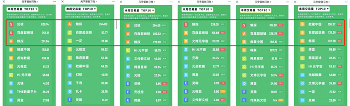 从单独的平台来看,据相关数据,头部数字藏品平台的成交额处于剧烈波动之中,也有大幅下滑的情况出现,如7月第四周鲸探的成交额还在300多万元,但到了8月第一周,便仅有100多万元,该周最高的数藏中国交易额也才136万元,相比7月第一周排名第一的幻核的800多万元,差距不可谓不明显。