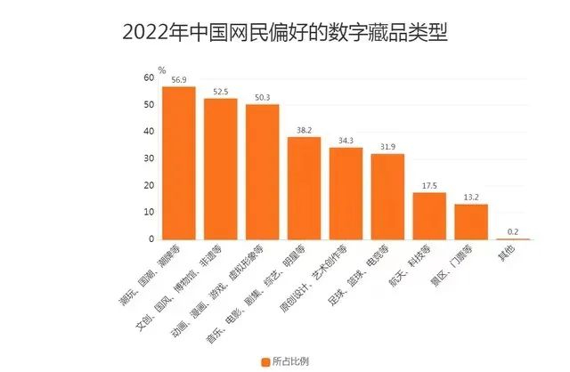 据了解,国潮、国风是网民比较偏好的数字藏品类型。随着国潮的兴起,文物通过数字藏品的风潮逐渐走进大众视野,一些博物馆销售的文创数字藏品,成为现象级爆款。艾媒咨询相关调查报告显示,2022年中国网民偏好的数字藏品类型中,“潮玩、国潮、潮牌”等占据56.9%的比重,位居第一,其次是“文创、国风、博物馆、非遗”等,占比52.5%,“动画、漫画、游戏、虚拟形象”等则位列第三。