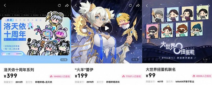 8月10日,B站基于平台虚拟偶像推出的花花Haya数字藏品开放报名,8月9日,还有B站原创数字藏品IP“干杯”与故宫宫苑联名打造的藏品系列《干杯!故宫》上线。7月则有《伊万生日会数字藏品》《冰糖IO数字藏品》(虚拟主播数字藏品)、《亿点点海洋探秘》《人间梦游音乐藏品》《洛天依十周年系列数字藏品》《“盛夏果实”2022毕业季数字藏品》(UP主数字藏品)、以及与坏猴子影业联合发行的首款电影联名数字藏品《大世界扭蛋机联名数字藏品》、哔哩哔哩游戏发行的《坎公骑冠剑》的数字藏品“火羊”蕾伊等开启活动。