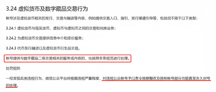 6月下旬,微信公众平台《行为规范》新增数字藏品交易行为相关条款,明确提出未取得审批文件或相关许可从事虚拟货币或数字藏品类业务为违规经营行为,提供数字藏品二级交易相关服务或内容,则可能被责令处理。