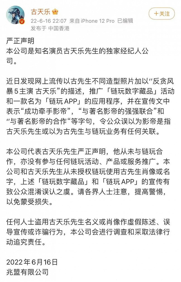 除此之外,数字藏品行业的版权问题也较为突出,除了今年4月杭州互联网法院公开审理的国内NFT侵权第一案,以及5月幻核发售的徐悲鸿数字藏品被指未经授权,6月还有著名影视剧演员古天乐发布相关声明,辟谣其与某数字藏品平台的合作,其表示从未与链玩合作,亦没有参与任何链玩活动、产品或推广服务。相关话题还登上微博热搜,超高关注度的行业乱象,亦可见一斑。