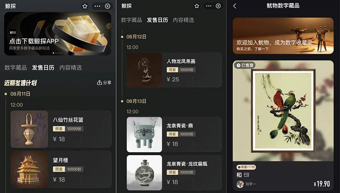 在优酷APP中的“鱿物”,也是如此,以文博文创为核心。该平台8月4日发售了一款名为《和》的数字藏品,限量777份,售价19.9元,该款藏品灵感来自中国传统节日七夕,监制方为中国文物交流中心。