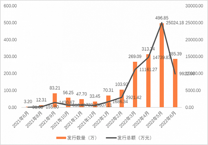 虽然大多数藏品平台依旧在进行相关业务,同时拉来IP,但除了数字藏品愈发不好卖,藏品的上新速度或数量也在降低,相关报告显示,2022年1月以来,我国单月数字藏品发行量不断走高,2022年5月甚至达到496.85万件,发行总额超过2.5亿元。但在6月份,数字藏品在发行量和发行总额上均呈现显著的下降趋势。