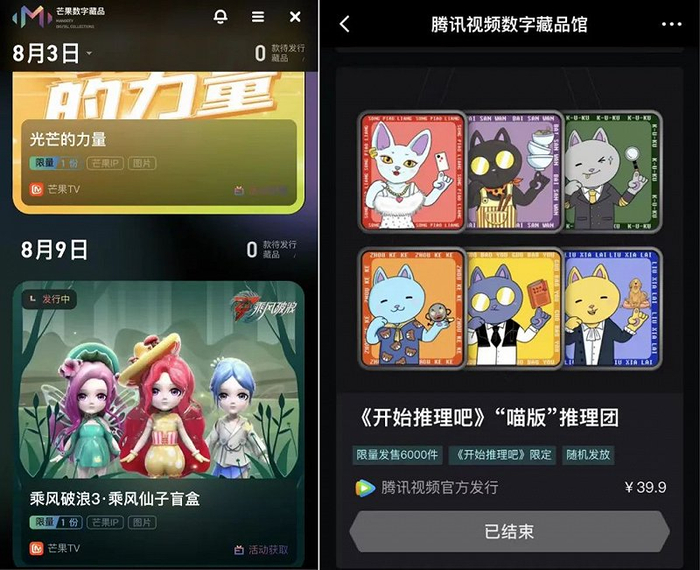 排名第四的综艺、剧集等类型数字藏品,也有不少平台在发。芒果TV近期就发行了旗下热门综艺IP《乘风破浪》第三季的数字藏品盲盒,还有与平台综艺《100道光芒》相关联的《光芒的力量》数字藏品,依旧在活用平台IP;腾讯视频内嵌的数字藏品馆,于7月初发售了以平台综艺《开始推理吧》和《战至巅峰》为灵感的数字藏品,售价均在几十元左右。