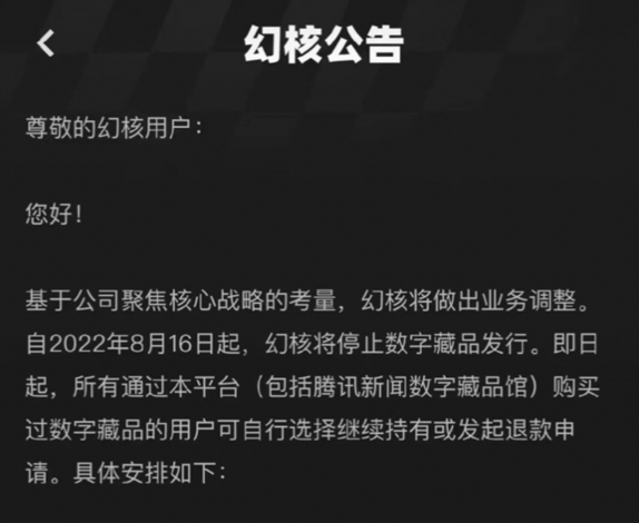 8月16日,腾讯幻核发布公告,称基于公司聚焦核心战略的考量将做出业务调整。自2022年8月16日起,幻核将停止数字藏品发行,同时所有通过其平台购买过数字藏品的用户可自行选择继续持有或发起退款申请。
