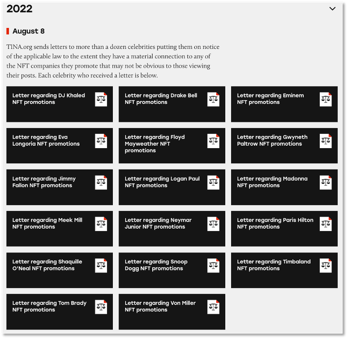 8月TINA对17位推广NFT的名人发出警告信