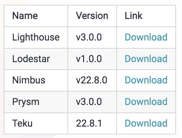 值得强调的是,虽然它们都是共识层客户端版本的一部分,但运行信标链节点与运行验证器客户端是不同的。质押者必须同时运行两者,而节点运营商只需要运行前者。这篇文章更详细地解释了这两个组件之间的区别。