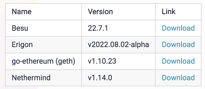 以下客户端版本支持以太坊主网的合并升级,注意,节点运营商必须同时运行执行层和共识层客户端,才能在 合并期间和之后保持在网络上。