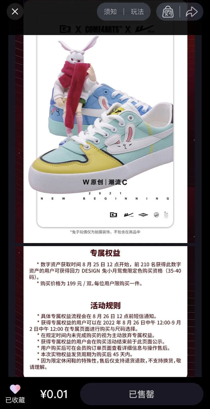 值得注意的是,通过NFT领域“赋能”的方式,该藏品确实将实体经济与数字资产相连。活动介绍表明,获得“回力DESIGN-元年”数字资产后,前210位用户可获得回力限量鞋款“DESIGN兔小月鸳鸯限定色”实体首发的购买资格。